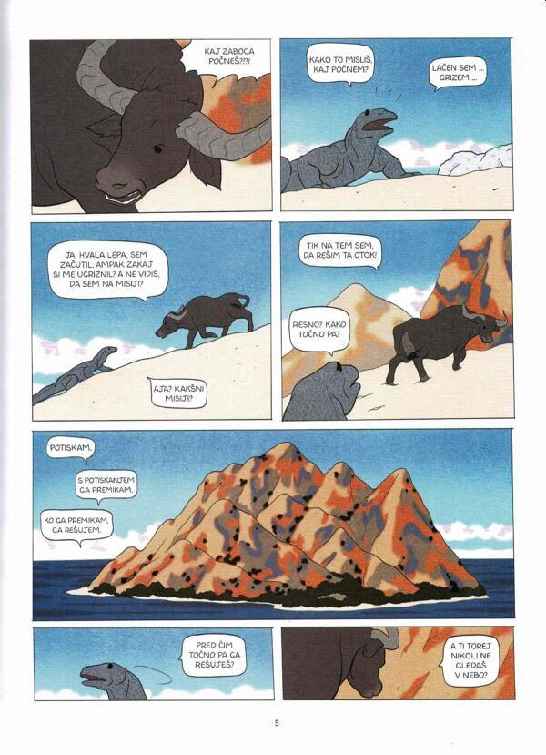 Z vso silo sune bivol v skalno steno in se z rogovi zarije v pobočje gore, da bi premaknil otok. Kajti otok je obsojen na propad; komet, ki leti po nebu, bo kmalu trčil naravnost vanj. Toliko ve bivol. Videl ga je v svojih sanjah in to pove komodoškemu varanu, ki se mu pridruži v njegovih prizadevanjih za rešitev otoka, kjer živita. Preberite več