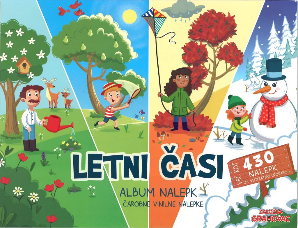 Knjiga vsebuje 4 tematska, čudovito obarvana ozadja, na katerih lahko otroci ustvarjajo svoje zgodbe. Na voljo je več kot 430 nalepk za večkratno uporabo z motivi letnih časov: pomlad, poletje, jesen in zima. Preberite več