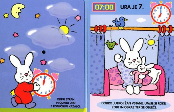 Z zajčkovo pomočjo se lahko vaš otrok nauči osnovnih časovnih pojmov. Stran z uro se odpre, tako da vaš malček lahko prilagodi kazalce vsaki strani, ki jo odkrije. Kartonka, 17 x 22 cm, 16 strani.