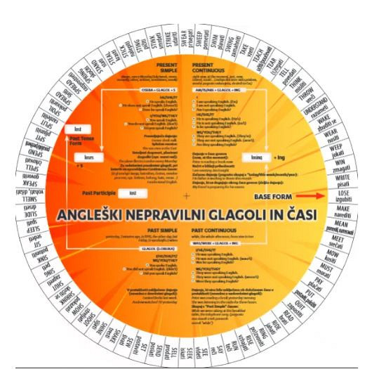 Obojestransko potiskano vrtljivo kolo zajema 128 nepravilnih glagolov (vseh tistih, ki jih je v osnovni šoli potrebno znati).