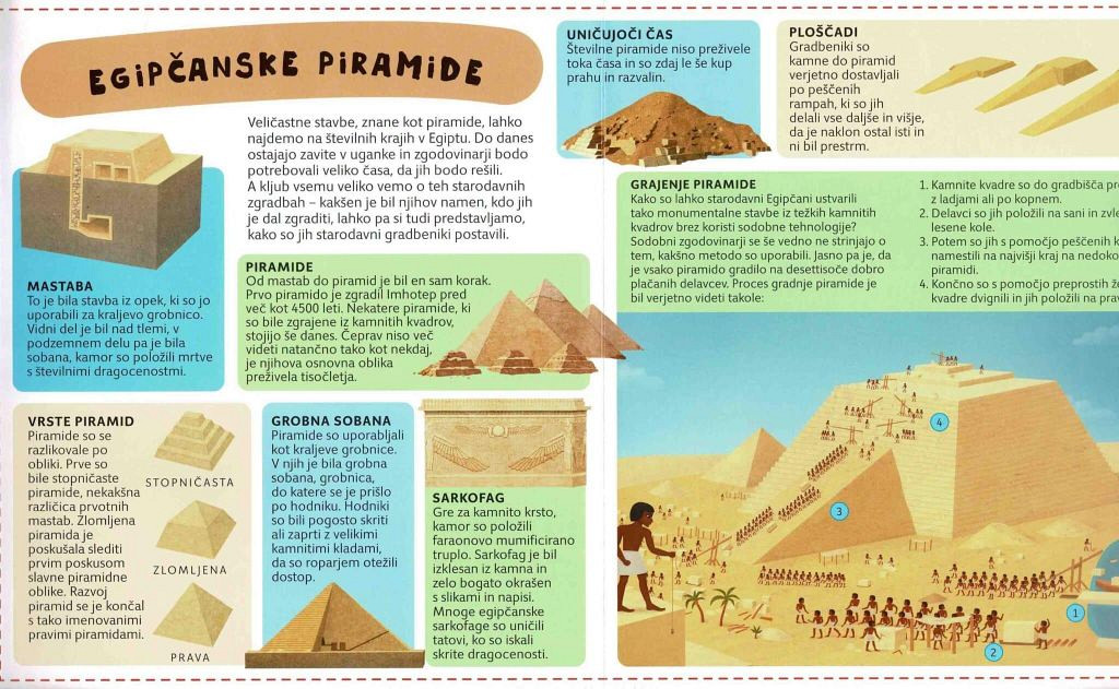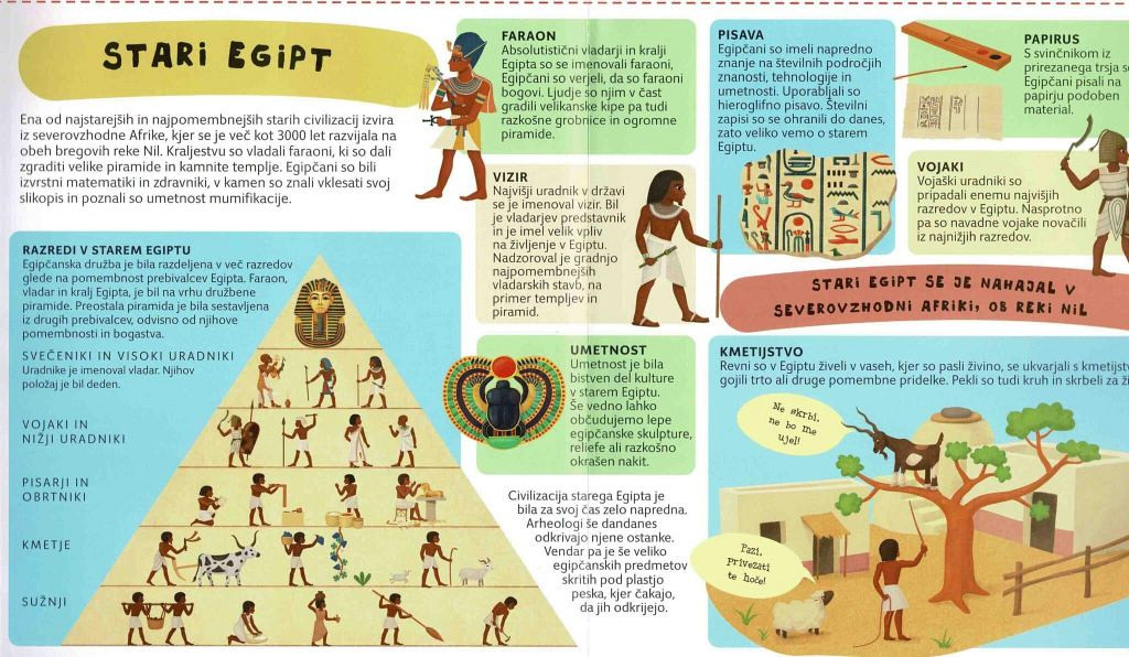 Piramide, templje, grobnice, kipe vladarjev, stebre, obeliske in druge spomenike lahko v Egiptu vidiš, kamor koli pogledaš. Kljub temu pa številne znamenitosti še vedno čakajo, da jih izkopljejo izpod afriškega peska. Ni še popolnoma jasno, kako so egipčanski graditelji zmogli zgraditi tako velike in lepe zgradbe s tehnologijo, ki so jo imeli v tistem času. Sprehodimo se skupaj. Oglejmo si najčudovitejše egipčanske znamenitosti. Poizvedimo, kakšno je bilo življenje v starem Egiptu za faraone, uradnike, vojake in navadne ljudi.