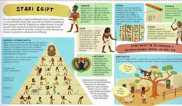V atlasu boste našli stari Egipt na šestih velikih zložljivih zemljevidih. Kako so bile videti najčudovitejše egipčanske stavbe v svojem najlepšem obdobju. Templje in zaklade starega Egipta. Egipčanske piramide, kako so bile videti in kako so jih zgradili. Egipčanske bogove in faraone. Dolino kraljev, grobnice in mumificiranje.