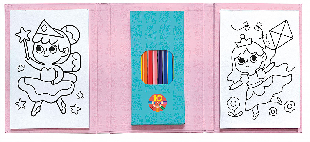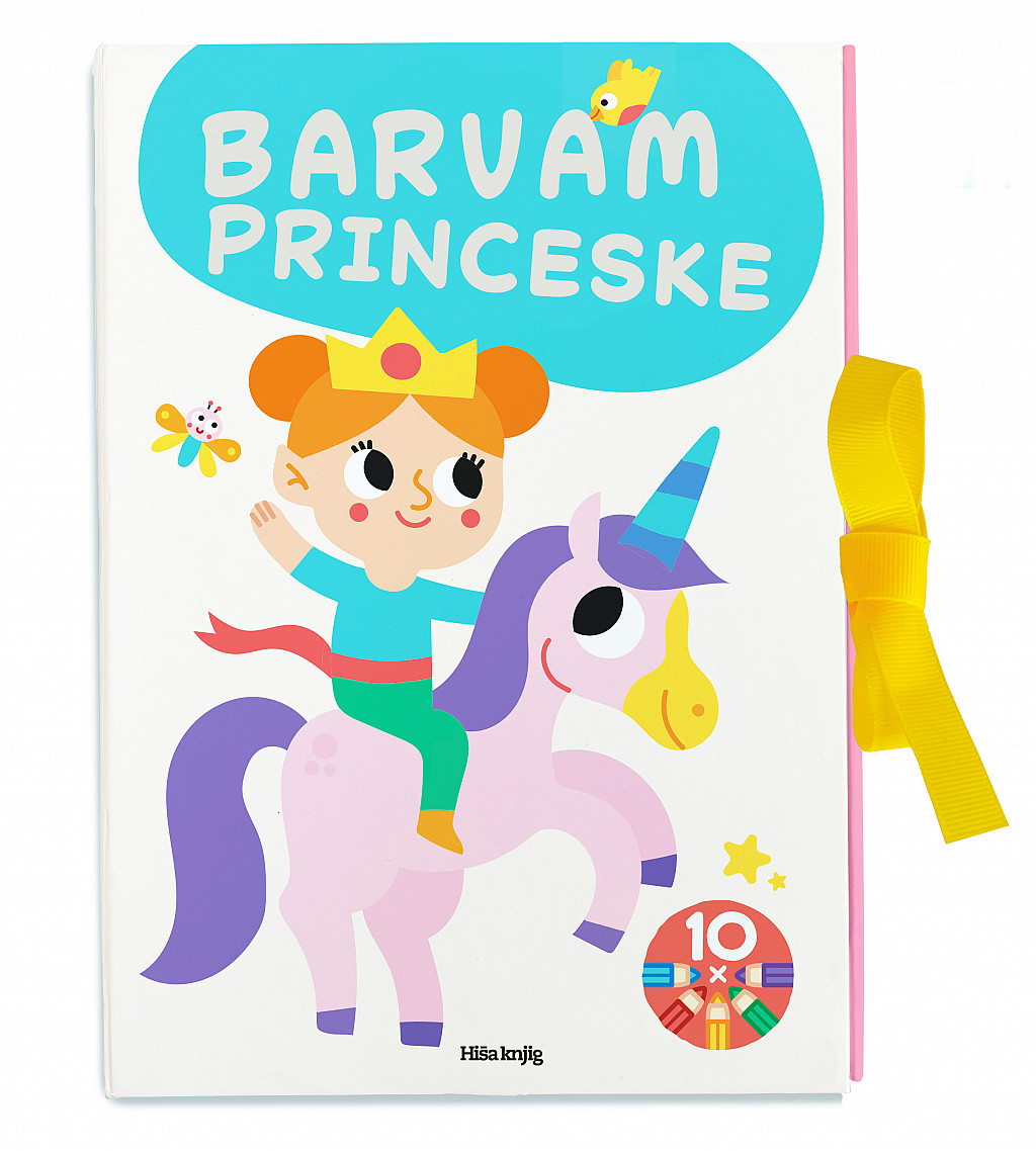 Knjiga, zavezana z rumeno pentljo skriva presenečenje – v njej sta dva bloka pobarvank, med njima pa škatla z desetimi mavričnimi barvicami. Motivi so izredno ljubki (ilustratorka je Lizzy Doyle). Upodobljene so princeske in vile, čisto take, kot je vaša domača princeska, ki jahajo veselega samoroga, spuščajo zmaja na cvetočem travniku, ravnokar zamahujejo s čarovno paličico … Različnih motivov je 2 x 24. Ko so pobarvani, jih je preprosto iztrgati in razstaviti med druge otrokove umetnine.