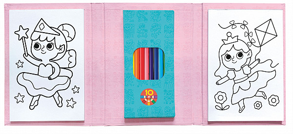 Pobarvanka z motivi princesk in pravljičnega sveta je zapakirana v darilno škatlo in zavezana z rumenim trakom. V notranjosti bodo otroci našli dva bloka po 24 pobarvank in na sredini škatlico z desetimi barvicami. Debele obrobe ilustracij otrokom pomagajo barvati bolj natančno ter razvijati fino motoriko.