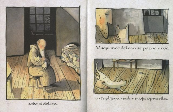 Zgodba je nastala po starodavni irski pesmi Pangur Bán iz začetka 9. stoletja. Na rob nekega rokopisa jo je zapisal neznani irski menih. Govori o učenem menihu, ki je v svoje preprosto življenje sprejel belega muca, Pangurja. Z njim si je delil samostansko celico, igrivega, nemirnega duha in veselje do dela. Vsak je bil zaposlen po svoje. Nobeden ni nobenega motil. Oba pa sta v prijateljstvu in delu našla srečo in svetlobo.In res se zdi, da v Belem mucu in menihu, uspe ilustratorju iz črnila izvabiti svetlobo, kot jo je nekoč iz rokopisov naš menih, zatopljen v iluminiranje.Trda vezava, 21 x 27 cm, 28 strani. Preberite več