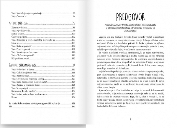 In kar je najpomembnejše, naučil se bo spoštovati in ceniti svojo edinstvenost in edinstvenost drugih. S pomočjo te praktične in učinkovite knjige bo spoznal, kako ustvariti odnos do sebe, ki je poln razumevanja in sočutja, tako da se bo naučil, kako začutiti in spoznati vrednost tega, da si, kdor v resnici si. Ko se bosta njegov pogled nase in razumevanje sebe spremenila, se bo izboljšala njegova samozavest, hkrati pa bo usvojil nove pozitivne navade, ki mu bodo služile do konca življenja.« - Amanda Ashman-Wymbs, svetovalka in psihoterapevtka