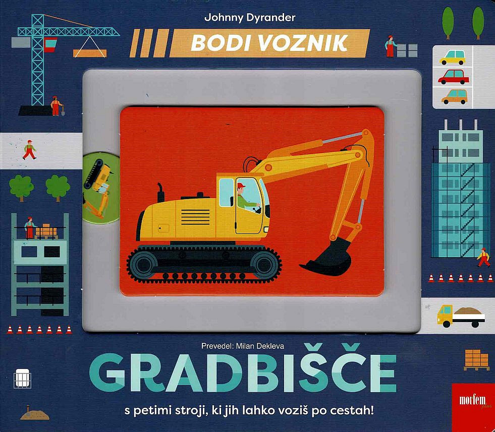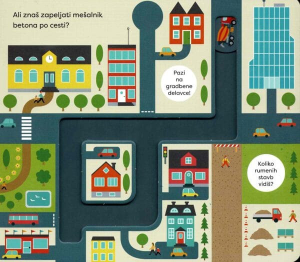 Zapelji jih po cestah na gradbišču. Otroci bodo ob knjigi interaktivno sodelovali in se urili v fino motoriki.
