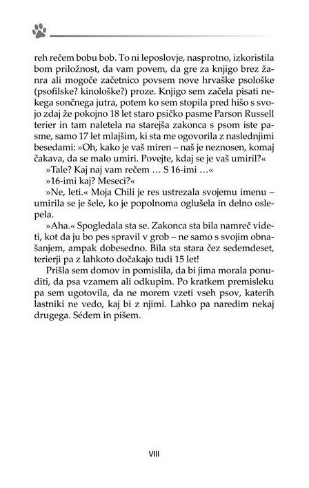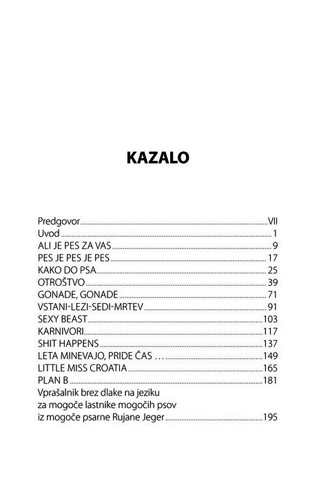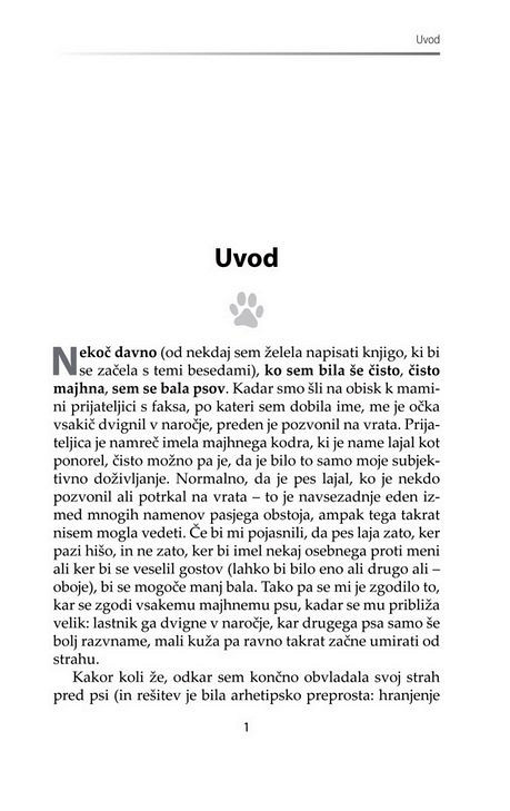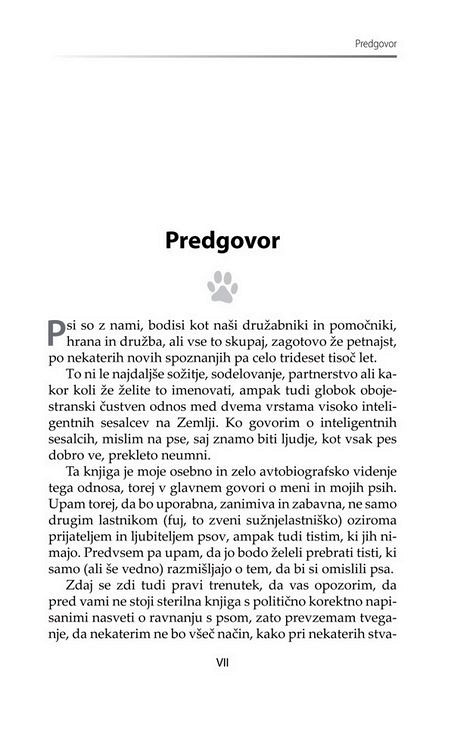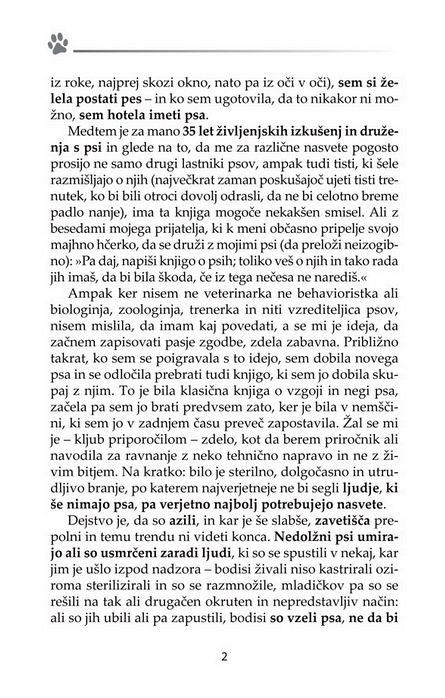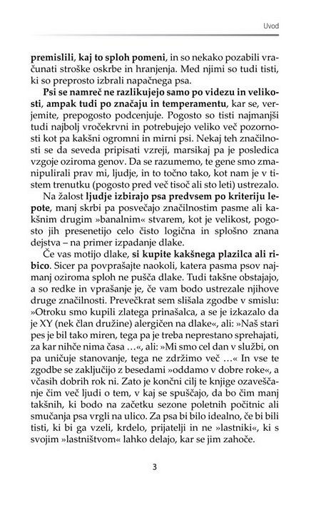 Predvsem je treba pametno izbrati, ko gre za vašega prvega psa. Ljudje, ki nikoli niso imeli psa, so kot ljudje, ki še nikoli niso bili zaljubljeni - vedo, da je to nekaj fantastičnega, ampak ne vedo, za kaj točne gre. Avtorica opozarja, da pred vami ne stoji sterilna knjiga s politično korektno napisanimi nasveti o ravnanju s psom in prevzema tveganje, da nekaterim ne bo všeč način, kako pri nekaterih stvareh reče bobu bob.