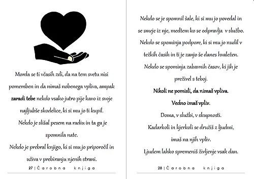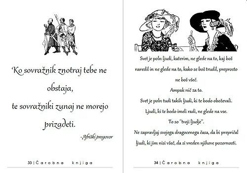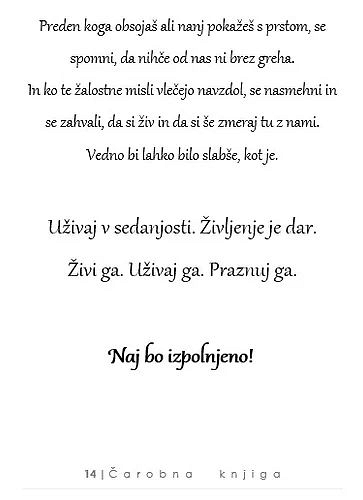 Tisti, ki ne verjamejo v čarobnost, je ne bodo nikoli našli. Čarobna knjiga je zbirka novodobnih misli in zgodb, ki na nas delujejo nadvse navdihujoče in motivacijsko. Spodbujajo nas, da premislimo o tem kdo smo, česa si želimo in na kaj smo pozabili ter s čim predolgo odlašali. Tisti, ki radi berete misli na različnih družabnih omrežjih, boste v njej prepoznali kar nekaj znanih modrosti, pa vendar teh ni nikdar preveč – še vedno namreč v vsakodnevnem delovanju vse prevečkrat pozabljamo nanje, preden jih ponotranjimo in začnemo živeti tisto, česar nas učijo. Pustite, ča Čarobna knjiga spremeni tudi vas!