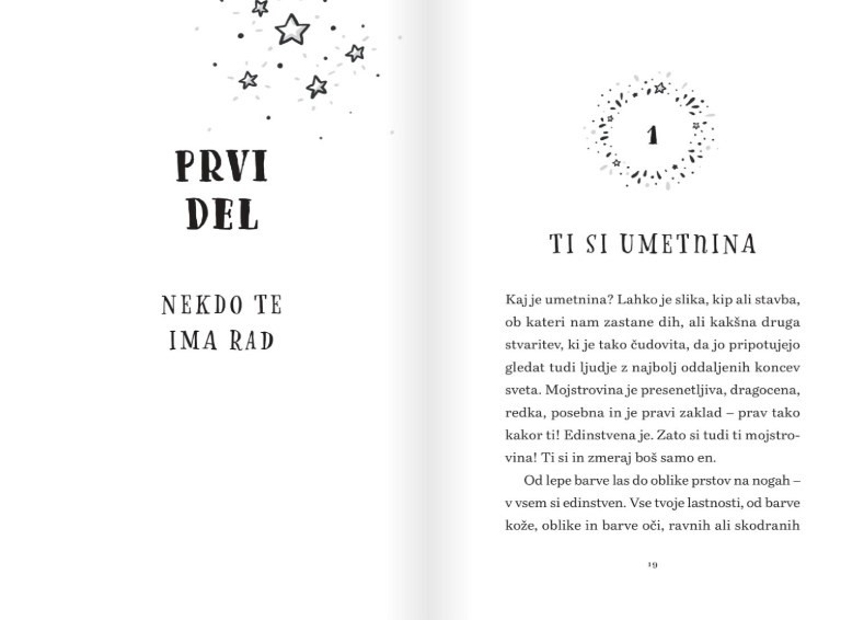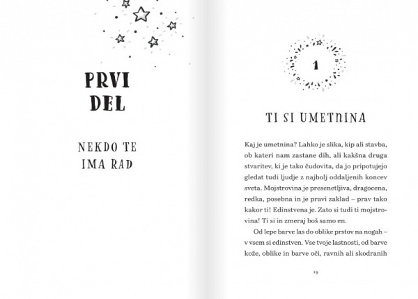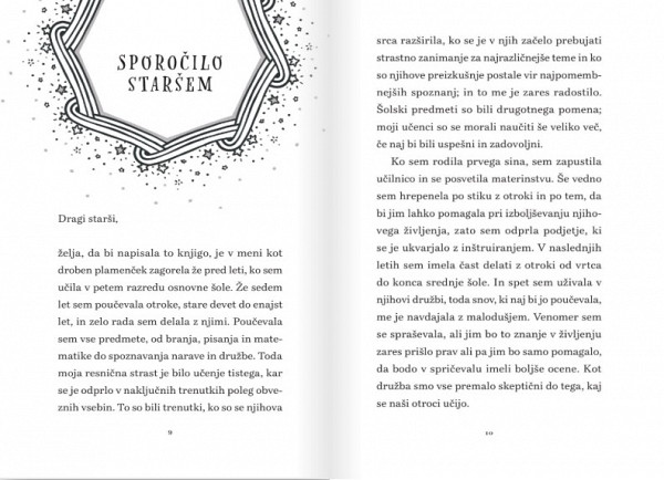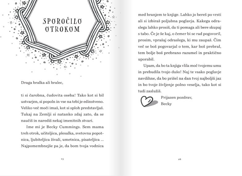 To knjigo sem pisala z namenom, da bi jo brali skupaj z otrokom in naglas. Toda odločitev, kako jo boste delili z njim, je vaša. Lahko jo bereta tudi vsak zase. Če pa se odločite, da jo bosta doživljala skupaj, z branjem naglas, vedite, da se bosta skupaj podala na zanimivo potovanje. Ta poglavja bodo za oba izziv, saj bodo spreminjala vaš pogled na svet in odpirala nova vprašanja.«