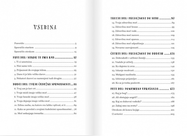 Ta čudovit priročnik jim bo na prijazen in otroku razumljiv način približal ideje prijateljstva, ljubezni do sebe, skrbi za svoje telo, zdrave prehrane, zakona privlačnosti, pomoči drugim, prijaznosti, odpuščanja, meditacije, boga in še več.
