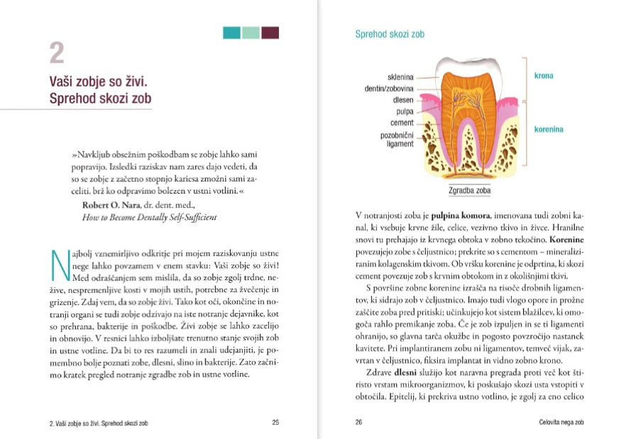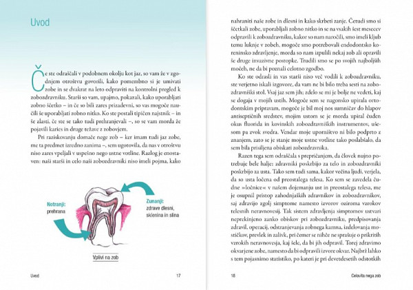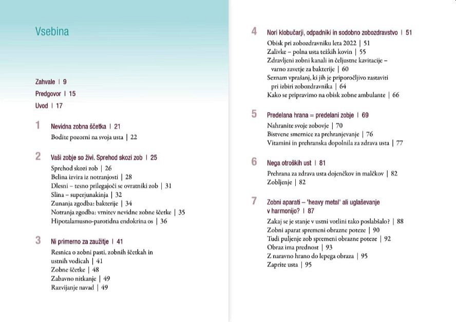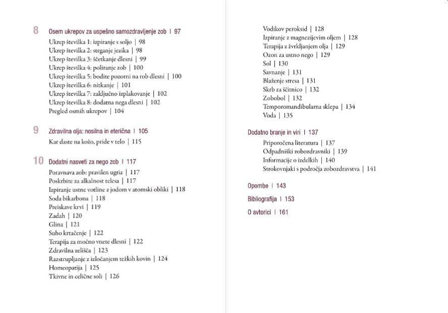Seznanili se boste s potrebno vsakdanjo nego, s pravilnim ugrizom in poravnavo, z metodami za ohranjanje zdravih dlesni in z razstrupljanjem ob izločanju težkih kovin. Knjiga je opremljena z več kot petdesetimi barvnimi fotografijami in ilustracijami.