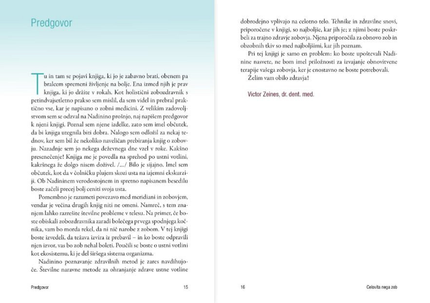 »Tu in tam se pojavi knjiga, ki jo je zabavno brati, obenem pa bralcem spremeni življenje na bolje. Ena izmed njih je prav knjiga, ki jo držite v rokah. Tehnike in zdravilne snovi, priporočene v njej, so najboljše, kar jih je; z njimi boste poskrbeli za trajno zdravje zobovja. Njena priporočila za obnovo zob in obzobnih tkiv so med najboljšimi, kar jih poznam.« - Victor Zeines, dr. dent. med.