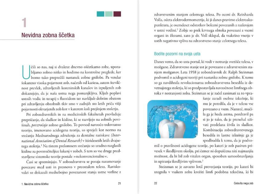 Knjiga Celovita nega zob vas ne uči zgolj odpraviti simptome, saj temelji na integrativnem pristopu k odpravljanju pravih vzrokov vaših težav z zobovjem. Seznanila vas bo s popolnoma naravnim biološkim zdravljenjem zob in z nego ustne votline brez kemikalij in vam tako pomagala ponovno vzpostaviti ravnovesje in zdravje celotnega organizma.