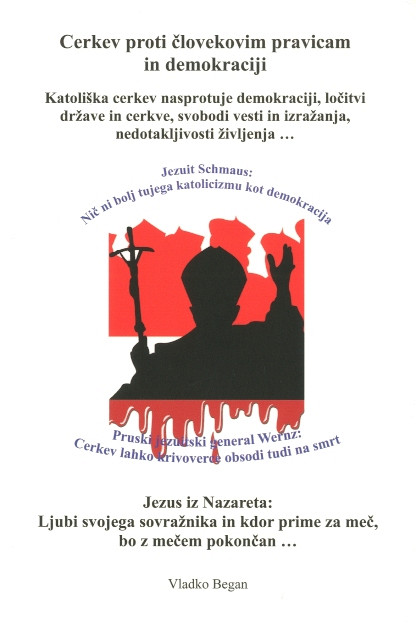Katoliška cerkev poudarja, da spoštuje in priznava človekove pravice in demokracijo. Toda ali je to res? Iz cerkvenega nauka, raznih izjav klera in cerkvene zgodovine je jasno, da katoliška cerkev v principu ne priznava niti demokracije niti človekovih pravic. Če jih navidezno priznava, jih priznava samo kot sredstvo za dosego svojih ciljev, ne pa kot vrednote same po sebi. Tako od svojih vernikov zahteva, da s pomočjo človekovih pravic in demokracije širijo in branijo katoliško vero. Cerkev priznava samo verske pravice ne pa pravic, ki izhajajo iz ljudstva kot suverena! Predvsem pa so v cerkvi na prvem mestu dolžnosti in ne pravice, saj se mora vsak verniki podrejati drugim, biti cerkvenim predstojnikom poslušen ter jih ubogati. Katoliška cerkev ne priznava temeljnih ustavnih pravic, kot npr. pravice do življenja (biblijske smrtne kazni, pravične vojne), svobode vesti oz. veroizpovedi (krst dojenčkov, nezmožnost celovitega izstopa …), svobode izražanja, volilne pravice, enakopravnosti (stalni napadi na homoseksualce … Je tudi proti ustavnemu načelu ločitve države in verskih skupnosti, pri čemer ji »pomaga« celo država, saj na veliko načinov v korist cerkve krši omenjeno načelo (državno financiranje cerkvene sfere, teološka fakulteta kot del javne univerze, cerkveni blagoslovi javnih objektov, vojaški kurati, RTV SLO kot »cerkvena prižnica« ...) Katoliška cerkev je tudi proti laičnem šolstvu in celo zahteva uvedbo takšnega ali drugačnega verouka v javno šolstvo.Mehka vezava, 13 x 20 cm, 303 strani.