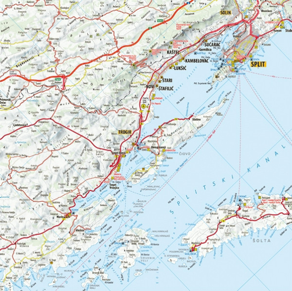 Vsebuje tudi mestne karte Splita, Šibenika in Zadra.