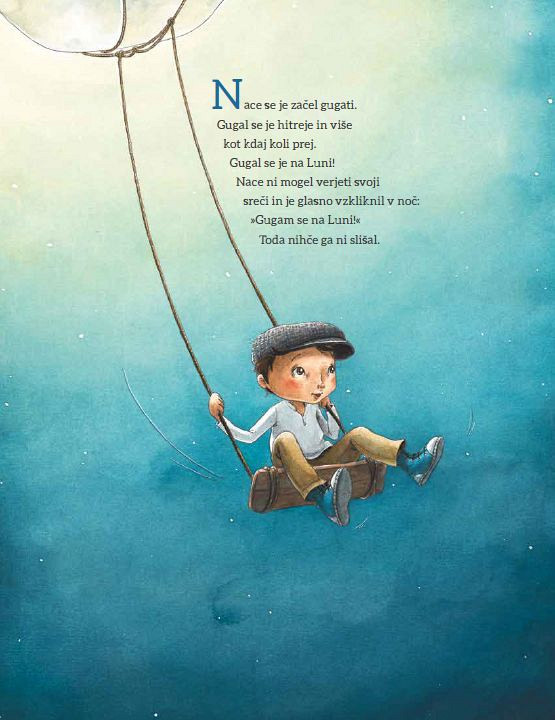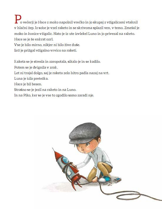 Tistega dne, ko je izginila Luna, se je Nace hotel igrati z vrvjo, Pika pa bi raje skakala na trampolinu. »Na trampolinu lahko samo skačeš,« je izjavil Nace prezirljivo. »Vrv pa se zdi za igro tako neuporabna,« mu je zdolgočaseno odvrnila Pika. Vsa zasanjana je dahnila: »S trampolinom lahko poletiš vse tja do neba.«