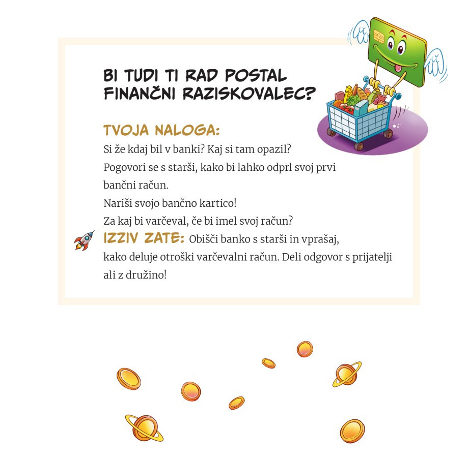 Namesto da bi bile finance zapletena in dolgočasna tema, jih spremenimo v raziskovanje skritih zakladov, reševanje ugank in odkrivanje skrivnosti, ki pomagajo pri pametnem ravnanju z denarjem. Nik in Eva, kot prava finančna raziskovalca, se na tej pustolovščini učita, kako prihraniti za svoje sanje, kakšne so pasti zapravljanja in kako lahko denar raste, če ga uporabimo pametno.