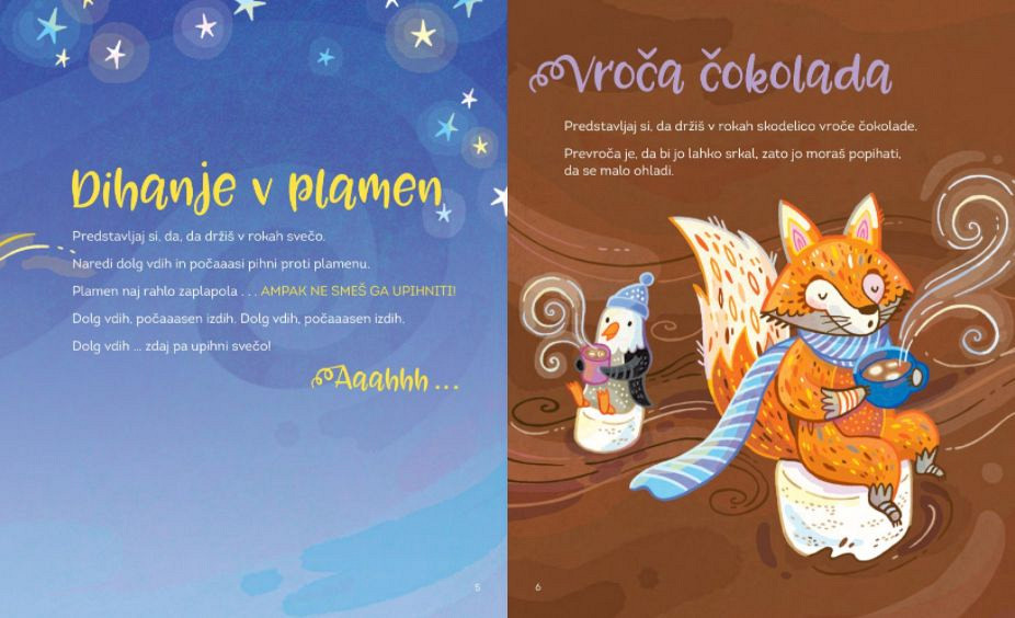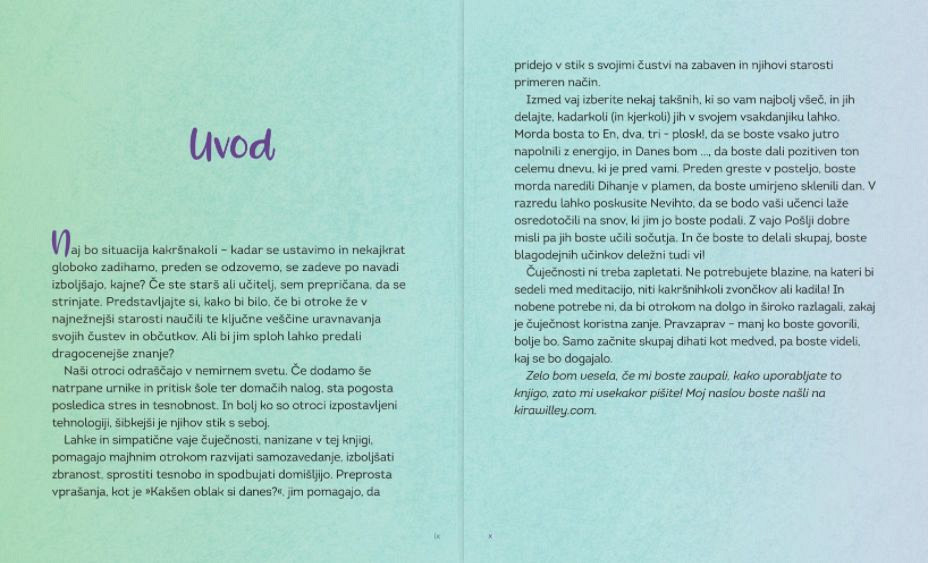 Lahke in simpatične vaje čuječnosti, nanizane v knjigi, pomagajo majhnim otrokom razvijati samozavedanje, izboljšati zbranost, sprostiti tesnobo in spodbujati domišljijo.