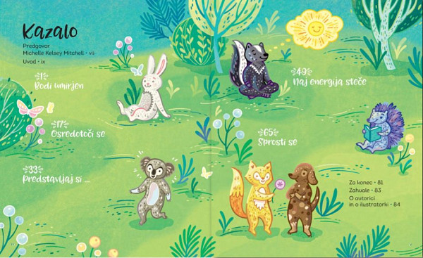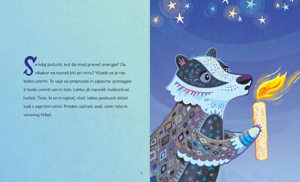 Knjiga je razdeljena na pet delov (Bodi umirjen, Osredotoči se, Predstavljaj si, Naj energija steče in Sprosti se), ki vsebujejo različne preproste vaje in očarljive ilustracije lisic, slonov, čudovitih oblakov in seveda medvedov.