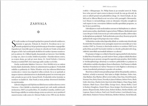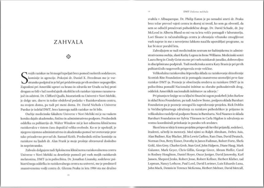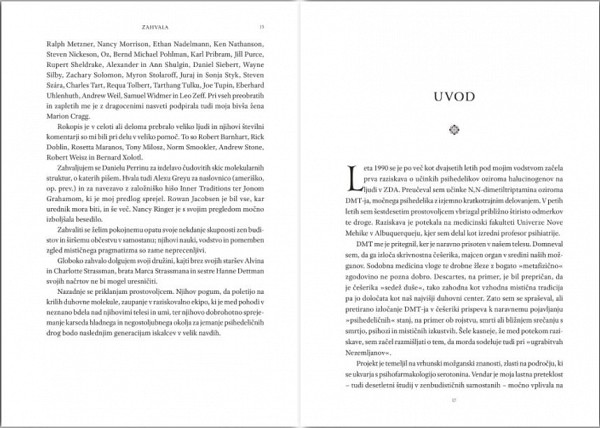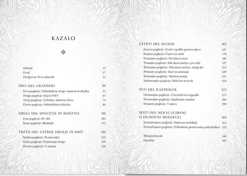 Njihovo doživljanje droge, ki ga v knjigi podrobno opiše, predstavlja izjemno zanimivo analizo človeškega uma in terapevtskega potenciala psihedelikov. DMT – kemikalija, ki jo pridobivamo iz rastlin in jo proizvajajo tudi človeški možgani – je večini prinašala obsmrtna in mistična doživetja. Mnogi prostovoljci so z vso gotovostjo poročali o srečanjih z inteligentnimi entitetami, ki niso ljudje, temveč večinoma »Nezemljani«. Za skoraj vse udeležence so bila ta srečanja najgloblje izkustvo njihovega življenja.