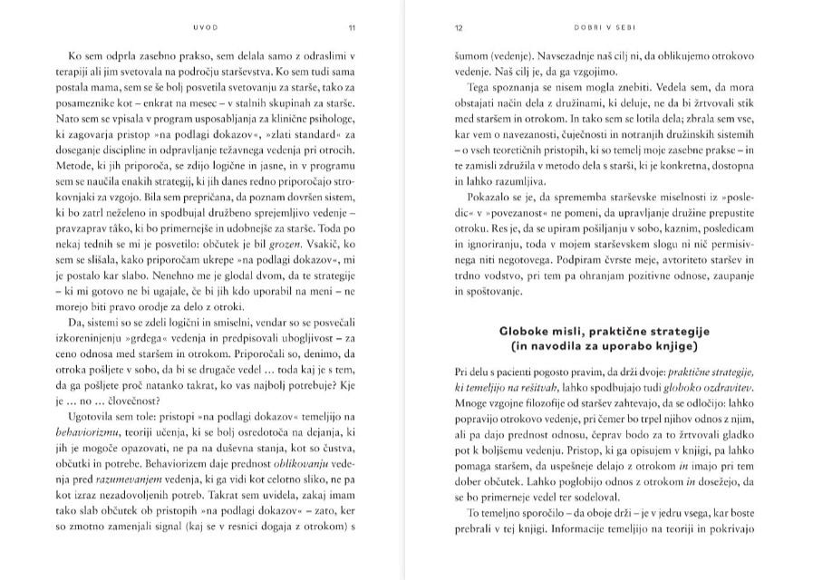 Pri delu s pacienti pogosto pravim, da drži dvoje: praktične strategije, ki temeljijo na rešitvah, lahko spodbujajo tudi globoko ozdravitev. Mnoge vzgojne filozofije od staršev zahtevajo, da se odločijo: lahko popravijo otrokovo vedenje, pri čemer bo trpel njihov odnos z njim, ali pa dajo prednost odnosu, čeprav bodo za to žrtvovali gladko pot k boljšemu vedenju. Pristop, ki ga opisujem v knjigi, pa lahko pomaga staršem, da uspešneje delajo z otrokom in imajo pri tem dober občutek. Lahko poglobijo odnos z otrokom in dosežejo, da se bo primerneje vedel ter sodeloval.
