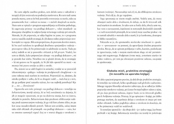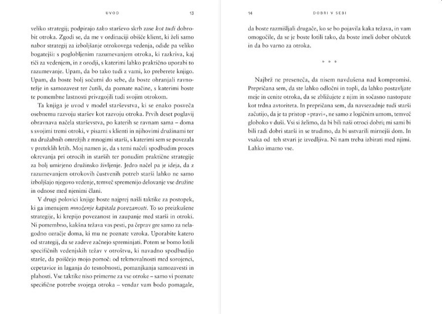 Knjiga ponuja vzgojna načela, ki spreminjajo naš pogled na to področje, in scenarije, po katerih lahko rešujemo težave – tudi pri sporih med sorojenci, tesnobi zaradi ločitve, cepetavici in še marsičem. Zato je izčrpen vir za generacijo staršev, ki bi radi svoje otroke vzgajali drugače, a jih tudi pripravili na vseživljenjsko samoregulacijo, samozavest in odpornost.
