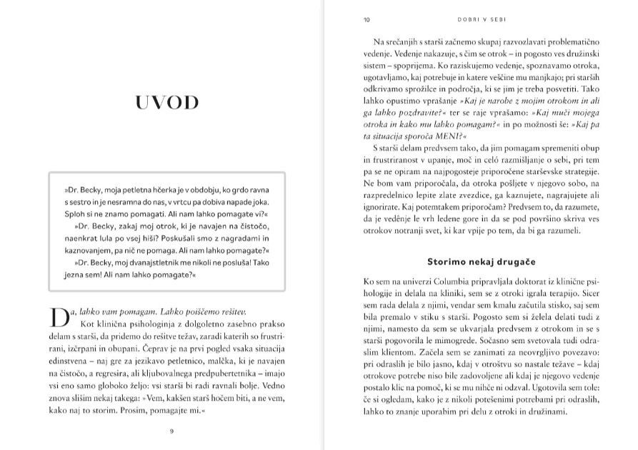 »Ta knjiga je primerna za vsakega starša, ki je kdaj s težavo nosil breme vzgoje – se pravi za vse nas. Dobri v sebi ni le moder in praktičen vodnik za vzgojo čustveno zdravih otrok, temveč je tudi vir podpore za preobremenjene starše, ki potrebujejo več sočutja in manj stresa. Dr. Becky je bistra, preudarna in praktična strokovnjakinja, na katero smo vsi čakali!« - Eve Rodsky, avtorica knjig Fair Play in Find your Unicorn Space, uspešnic New York Timesa