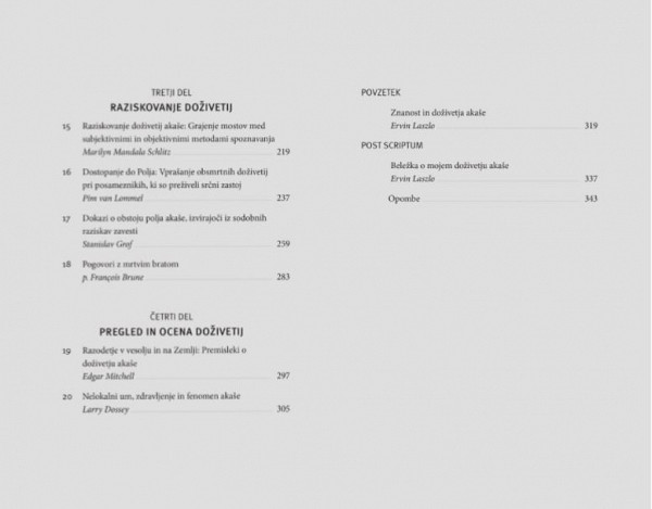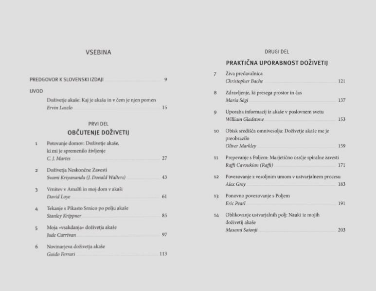 Prvi del knjige vsebuje poročila dvajsetih strokovnjakov s področij, kot so psihiatrija, fizika, filozofija, antropologija, naravno zdravljenje, obsmrtna doživetja in duhovnost, o njihovem osebnem doživetju akaše. Njihove izkušnje s poljem akaše so do zdaj že potrjene in podprte z dokazi vrhunske znanosti o obstoju polja kozmičnega spomina, ki vsebuje vse informacije iz preteklosti, sedanjosti in prihodnosti.