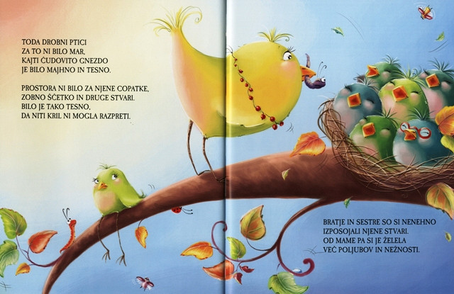 V čudovitem gnezdu prav na vrhu drevesa je sedem zelenih ptic uživalo najboljši razgled. Toda drobni ptici za to ni bilo mar. Kajti čudovito gnezdo je bilo majhno in tesno. Drobna ptica se je odločila poiskati nov dom. Najde ravno pravšnje gnezdo, ki pa ni povsem prazno, saj v njem leži jajce.Ta čudovito ilustrirana zgodba na koncu skriva veliko presenečenje.Trda vezava, 22 x 28,5 cm, 22 strani.