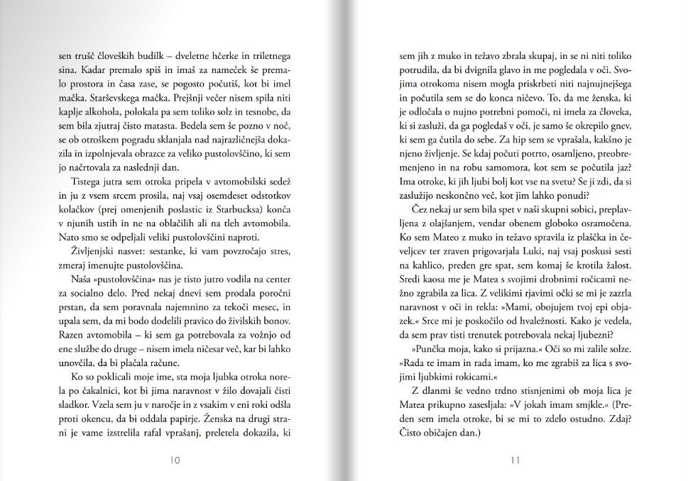 V knjigi pripoveduje med drugim, kako je z majhnima otrokoma v naročju obiskovala centre za socialno delo, se počutila ponižano pred referentko, ki se ni niti toliko potrudila, da bi dvignila glavo in ji pogledala v oči. Pripoveduje o tem, kako je prodala poročni prstan, da je poravnala najemnino za tekoči mesec, in upala, da ji bodo dodelili pravico do živilskih bonov … .