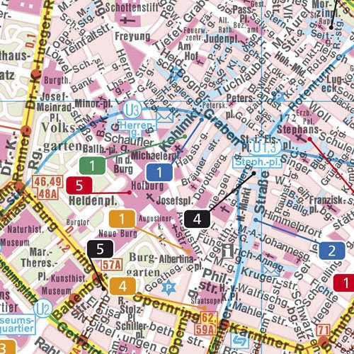 Žepna mestna karta Dunaja v merilu 1: 15 000. Karta vsebuje 5 naboljših:- nakupovalnih mest,- restavracij in kavarn,- kulturnih objektov,- barov za pestro preživljanje noči,- znamenitosti. Preberite več
