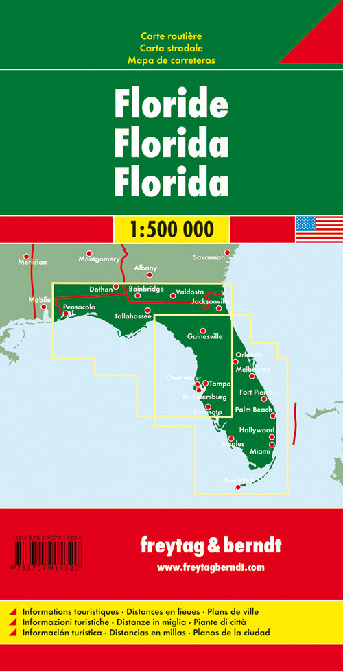 Na avtokarti Floride v merilu 1:1.500.000 je na voljo še veliko dodatnih informacij: turistične znamenitosti, nacionalni parki, kampi, razdalje v kilometrih in karte večjih mest. Priložen mestni register s poštnimi številkami omogoča hitro usmeritev. Preberite več