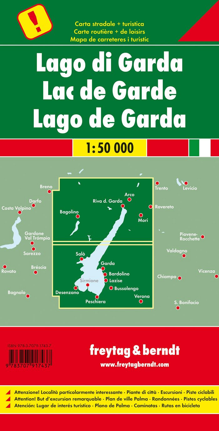 Na avtokarti Gardskega jezera v merilu 1:50.000 je na voljo še veliko dodatnih informacij: turistične znamenitosti, nacionalni parki, kampi in načrti ključnih mestnih središč. Poleg tega mestni register s poštnimi številkami omogoča hitro usmeritev. Preberite več