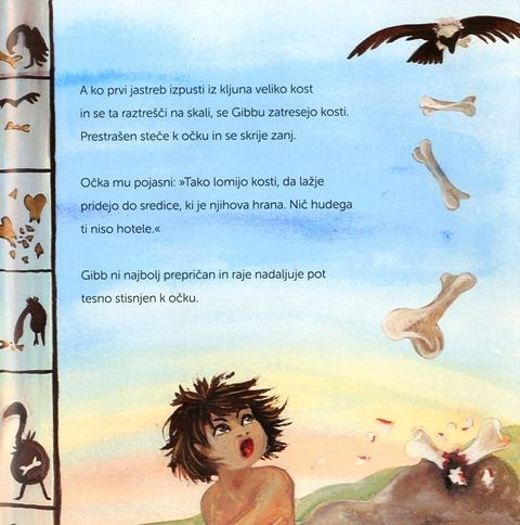 Gibb je mlad neandertalec. Njegova družina si išče nov dom in oče izbere Gibraltar. Ves čas jim sledi lačna hijena. Toda Gibb pozabi na nevarnost, ker ga popolnoma prevzamejo ptice. Toliko jih je in tako zanimive so. Tako rad bi se igral z njimi. Mu bo uspelo? Ali ga bo prej ujela lačna hijena?