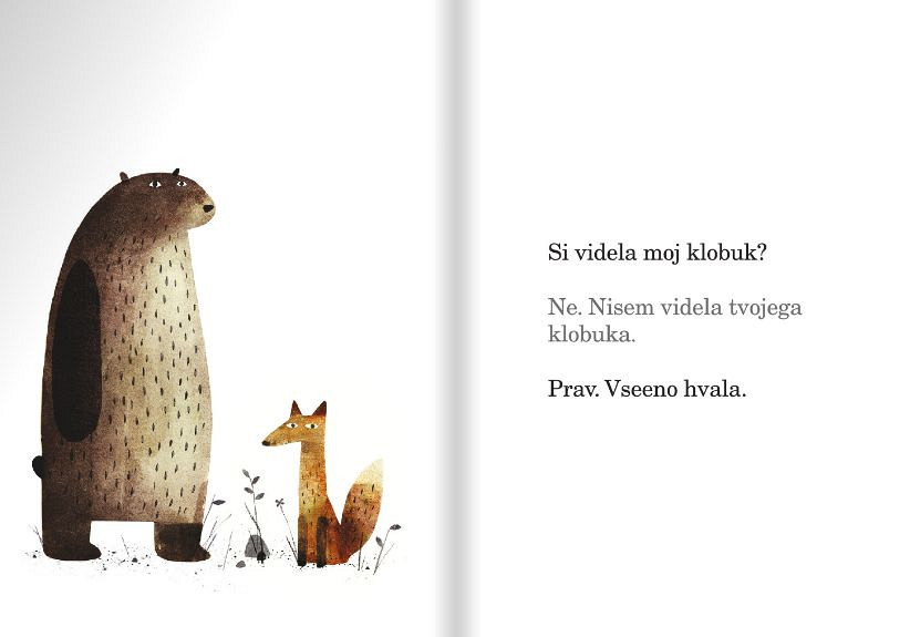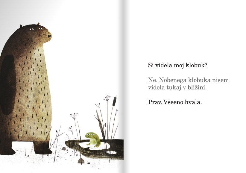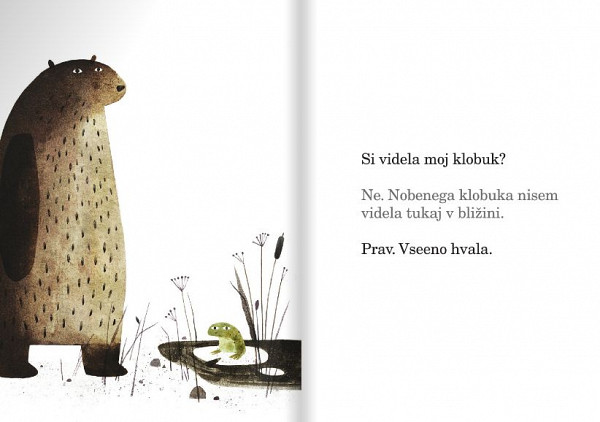 Čudovito ilustrirana slikanica z nepričakovanim zaključkom! Medved je izgubil klobuk in bi ga rad dobil nazaj. Potrpežljivo in vljudno sprašuje živali, ki jih sreča, ali so ga videle. Vse živali mu odgovorijo, da ga niso videle, nekatere so bolj zgovorne, druge manj.