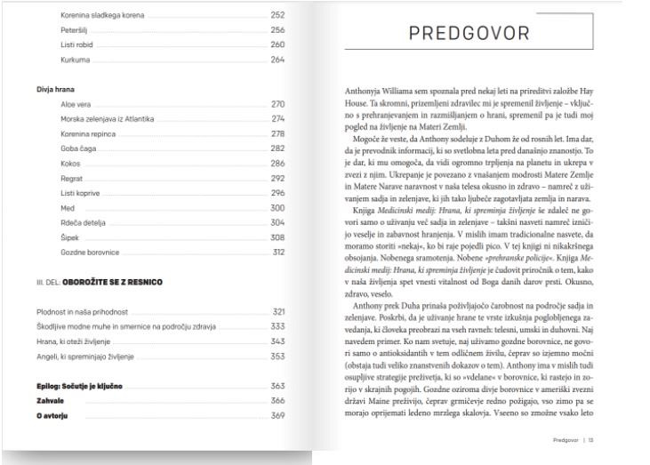 Medicinski medij Anthony William je že več deset tisoč ljudem pomagal, da so ozdraveli od bolezni, ki so jim jih napačno diagnosticirali ali neuspešno zdravili. V svoji prvi knjigi Medicinski medij je Anthony razkril, kako lahko številne bolezni pozdravimo z zdravilnimi metodami, v katerih ključno vlogo igra prehrana. Ta knjiga še bolj v globino raziskuje zdravilno moči več kot petdesetih sadežev, zelenjave, zelišč, začimb in divje hrane, ki lahko imajo izjemne učinke na vaše zdravje.