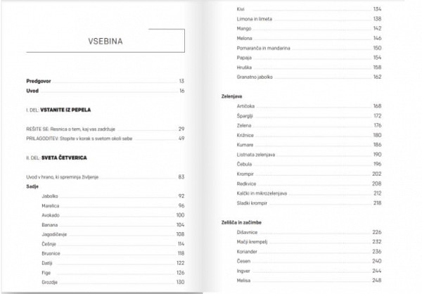 Prvih devetdeset strani je tako namenjenih človekovemu duhovnemu in telesnemu prebujenju, prilagoditvam na stres okoli nas, čustvenim koristim zaužite hrane in pomenu prehranskih obredov. V drugem delu pa predstavi posamezne sadeže (npr. jabolko, marelice, avokado, jagodičevje …), zelenjavo (artičoka, kumare, šparglji …), zelišča in začimbnice pa tudi divjo hrano (aloe vera, goba čaga, regrat, med …) in ponudi predloge, ob katerih stanjih in simptomih je treba kaj od njih zaužiti, kakšno čustveno podporo nudijo in kakšen duhovni nauk prinašajo. Predstavljeni so tudi preprosti recepti za napitke, solate, juhe in enostavne jedi, ki ohranjajo zdravje in spreminjajo življenje. (Beti Hlebec, Bukla 158)
