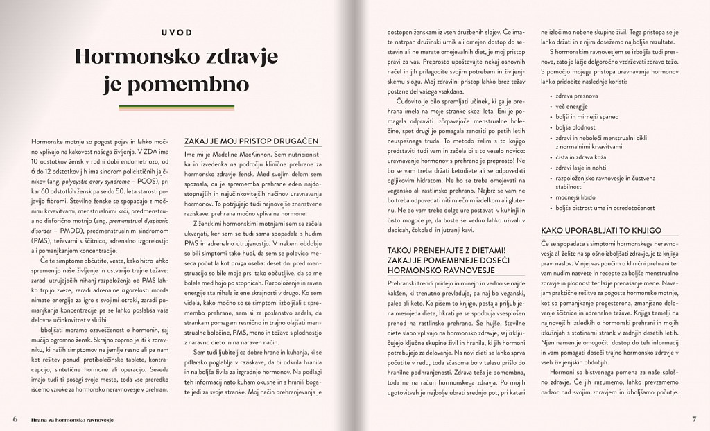 Se spopadate z nemogočimi menstrualnimi cikli, PMS, predmenstrualno disforično motnjo, povečano težo, pomanjkanjem energije in nihanji razpoloženja zaradi hormonskega neravnovesja? Knjiga Hrana za hormonsko ravnovesje vam ponuja dostopne rešitve za odpravo pogostih hormonskih motenj. Avtorica Madeline MacKinnon vas v njej popelje v svet hormonskega zdravja, od menstruacije do menopavze. Spoznali boste, s kakšno prehrano lahko uravnate svoj cikel in kako lahko nekatere priljubljene diete porušijo vaše hormonsko ravnovesje.