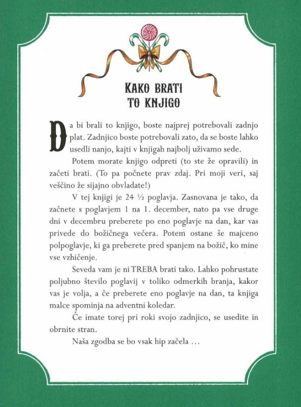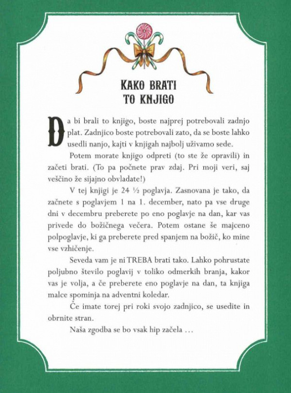 ODŠTEVAJTE DNEVE DO BOŽIČA v praznični knjigi s 24 poglavji in 1/2! BERITE JO KOT ADVENTNI KOLEDAR. S poglavjem 1 začnete 1. decembra, nato pa vse druge dni v decembru preberete po eno poglavje na dan, kar vas privede do božičnega večera. Potem ostane še majceno polpoglavje, ki ga preberete pred spanjem na božič, ko mine vse vzhičenje. Seveda vam je NI TREBA BRATI TAKO …