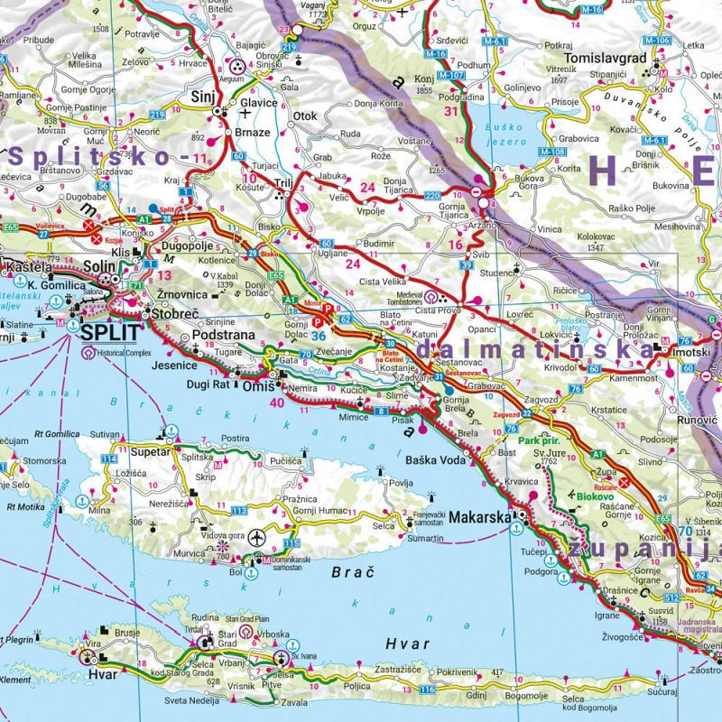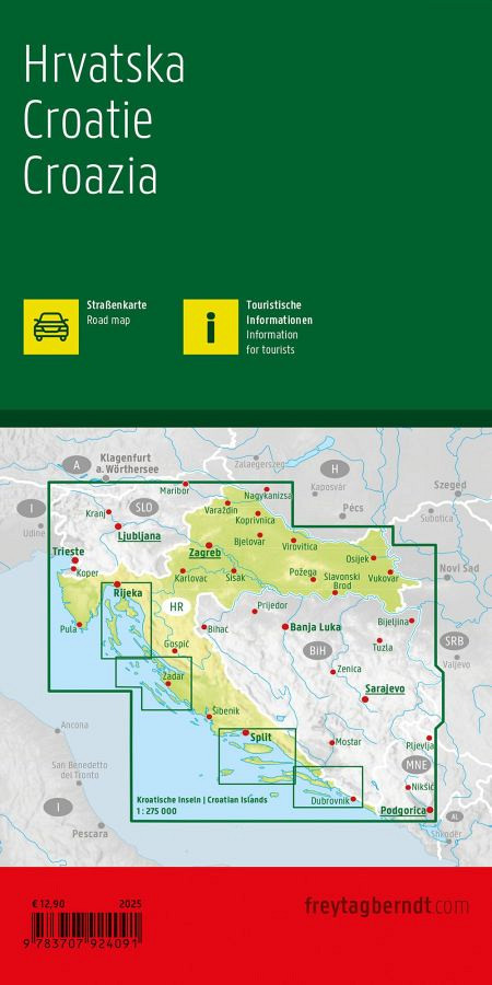 Z zemljevidom Hrvaške v merilu 1:500.000 se bodo počitnikarji, ki potujejo z avtomobilom, motociklom ali počitniškim prikolico, najbolje znašli. Razvejano cestno omrežje je natančno prikazano, razdalje in številne izletniške destinacije so označene na zemljevidu. Preberite več
