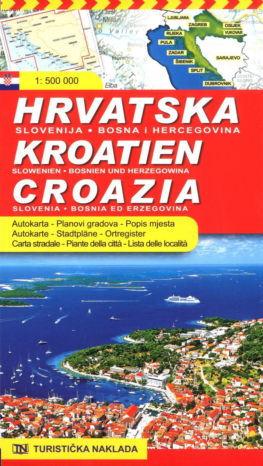 Avtokarta Hrvaške, Slovenije in Bosne z mestnimi načrti in popisom mest.Merilo 1 : 500 000Mehka vezava, 13 x 23,5 cm.