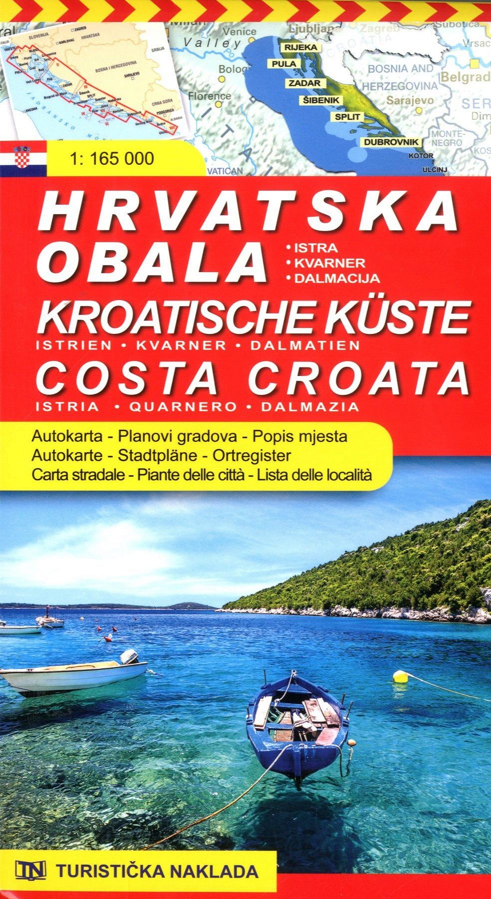 Avtokarta Istre, Kvarnerja in Dalmacije z mestnimi načrti in popisom mest.Merilo 1 : 165 000.Mehka vezava, 13 X 23,5 cm.