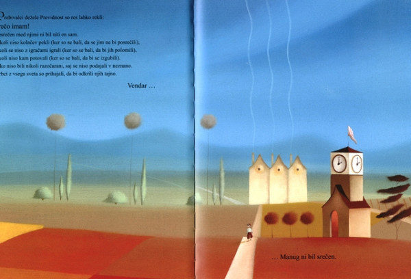 Manug je živel v deželi Previdnost. V deželi se nikoli niso igrali, ker so se bali, da bi polomili igrače. Nikoli niso pekli piškotov, ker so se bali, da bi se prismodili … A Manug ni bil srečen, zato se je odločil, da bo obiskal Srečno deželo. Obiskal je Sladko deželo, Ledenik radosti, Deželo razvajenih …