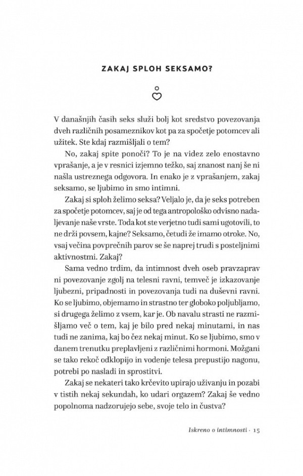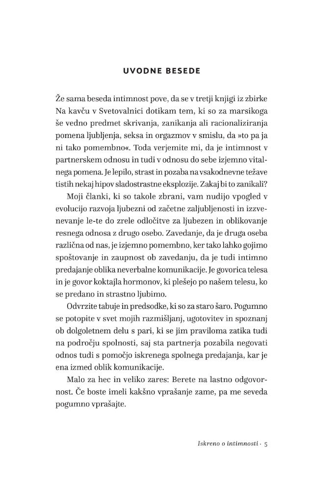 "V knjigi so zajeti članki, ki jih je pisala zadnjih deset let in ki so bili objavljeni na različnih spletnih mestih in v najbolj branih revijah. Takole zbrani tvorijo pregled izzivov, do katerih pride ob spoznavanju sveta spolnosti in iskrene intimne navezanosti na partnerja. Že sama beseda intimnost pove, da se v tretji knjigi iz zbirke Na kavču v Svetovalnici dotikam tem, ki so za marsikoga še vedno predmet skrivanja, zanikanja ali racionaliziranja pomena ljubljenja, seksa in orgazmov v smislu, da »to pa ja ni tako pomembno«. Toda verjemite mi, da je intimnost v partnerskem odnosu in tudi v odnosu do sebe izjemno vitalnega pomena. Je lepilo, strast in pozaba na vsakodnevne težave tistih nekaj hipov sladostrastne eksplozije. Zakaj bi to zanikali?