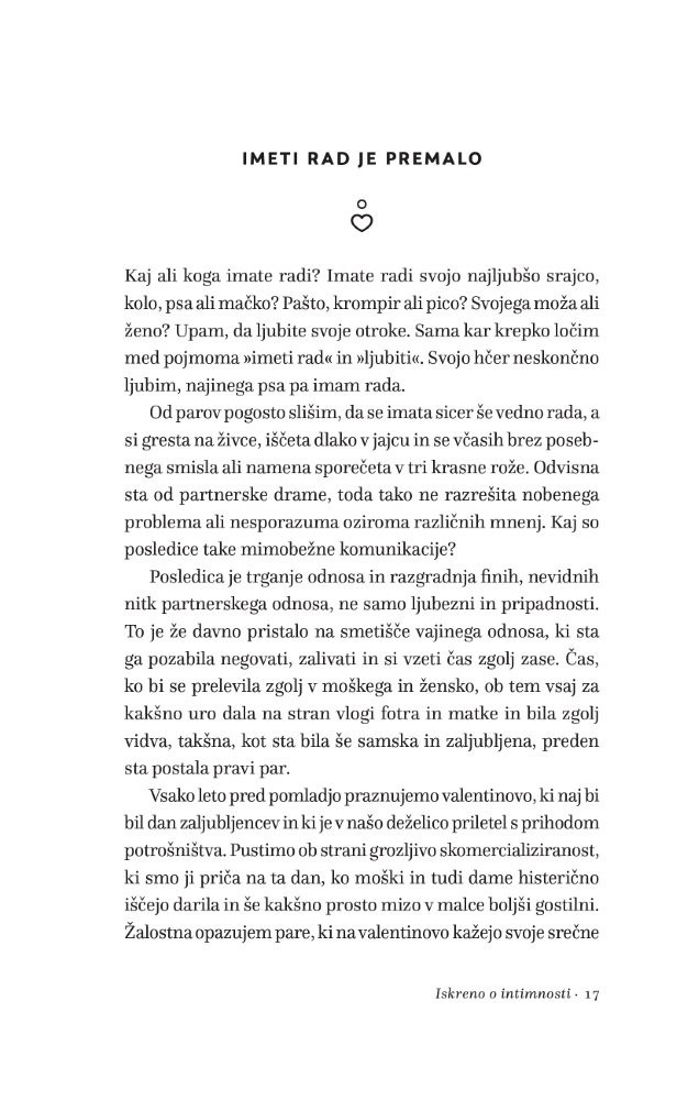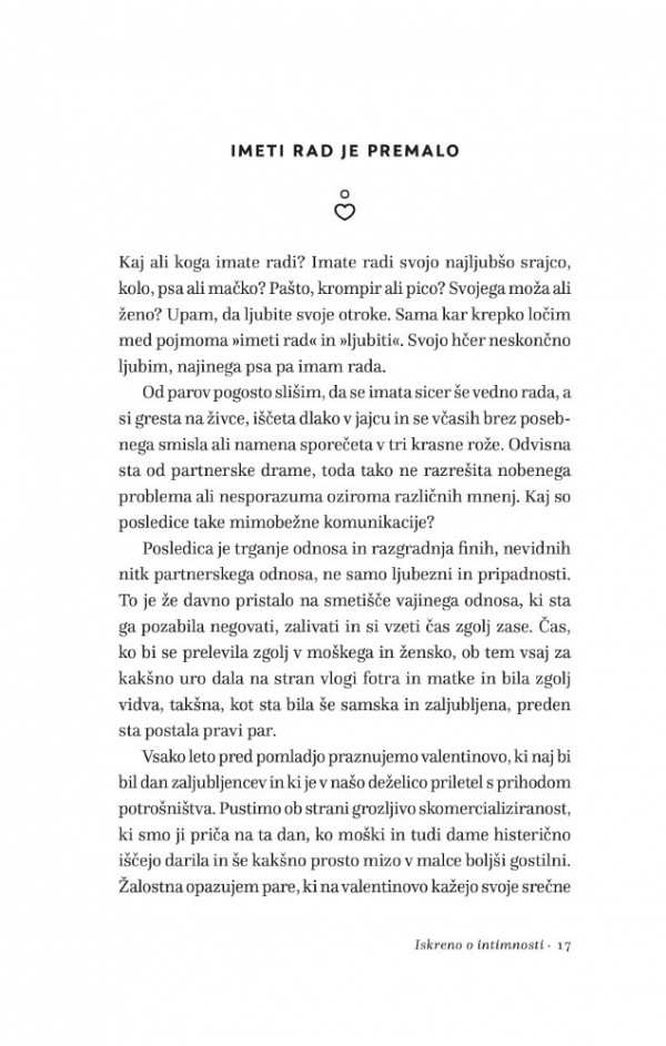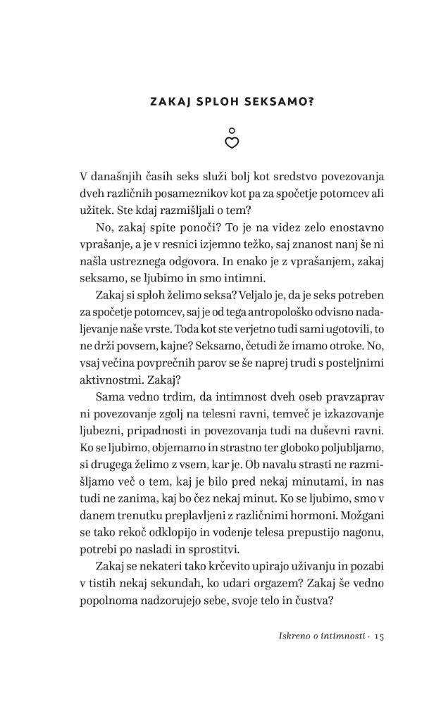 Odvrzite tabuje in predsodke, ki so za staro šaro.Pogumno se potopite v svet mojih razmišljanj, ugotovitev in spoznanj ob dolgoletnem delu s pari, ki se jim praviloma zatika tudi na področju spolnosti, saj sta partnerja pozabila negovati odnos tudi s pomočjo iskrenega spolnega predajanja, kar je ena izmed oblik komunikacije."