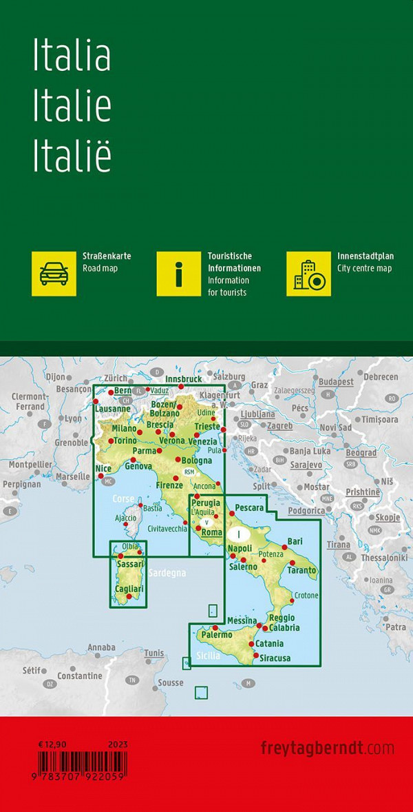 Na avtokarti Italije v merilu 1:600.000 je na voljo še veliko dodatnih informacij: turistične znamenitosti, nacionalni parki, kampi, razdalje v kilometrih, kazalo mest s poštnimi številkami in natančni zemljevidi mestnih središč. Preberite več