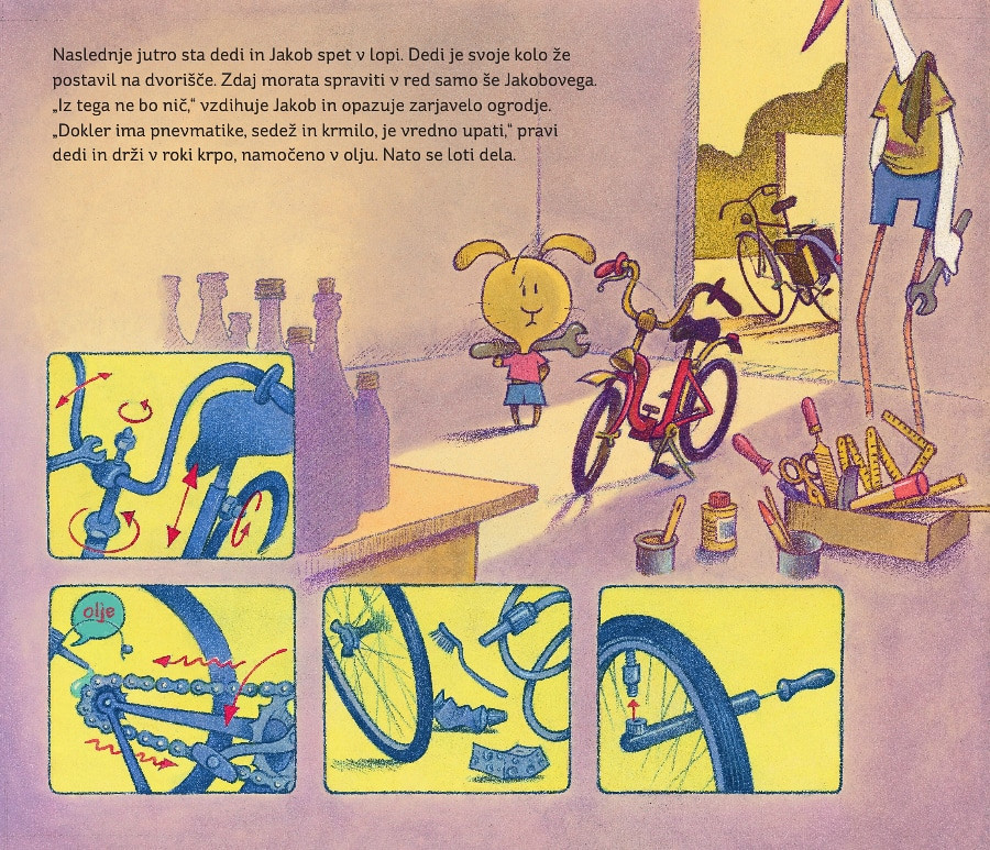 S skupnimi močmi ga popravita: zračnico zakrpata in verigo naoljita. Seveda pa kolo rabi tudi dobre zavore in zvonec – Jakob pa čelado. Kmalu je vse pripravljeno za odhod. Jakob in dedek se na poti do jezera vozita navzgor in navzdol. Niti prazna zračnica ju ne more ustaviti.