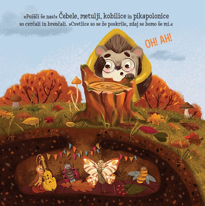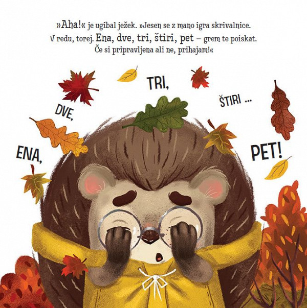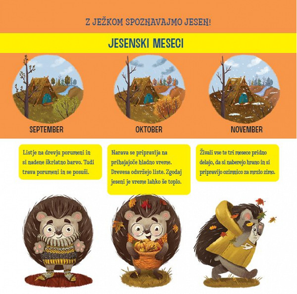 Ko pride jesen, gozdni prebivalci prav nič ne žalujejo za poletjem. Vsak po svoje se pripravlja na prihajajočo zimo. Ptice selivke že načrtujejo polet v južne kraje, žuželke pa se umirijo in zaspijo. Le kaj jeseni čaka radovednega ježka? Na koncu knjige te čakajo še zanimivosti o jeseni. Preberite več
