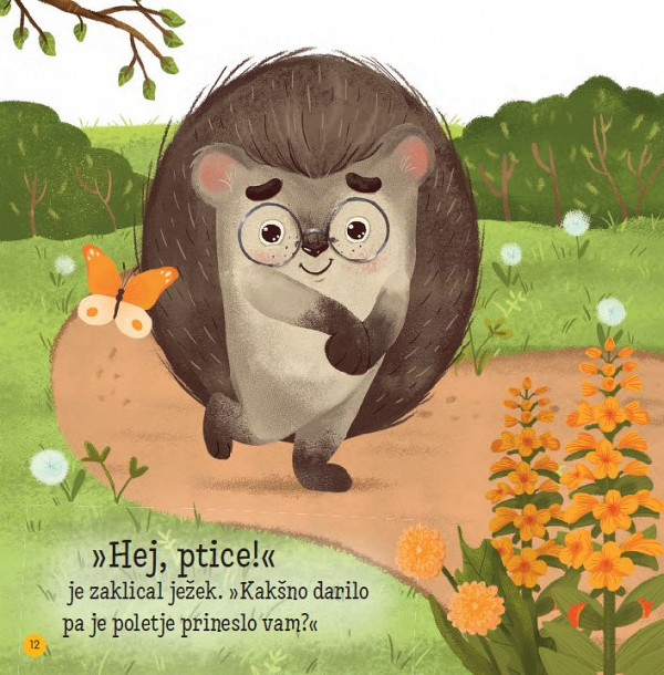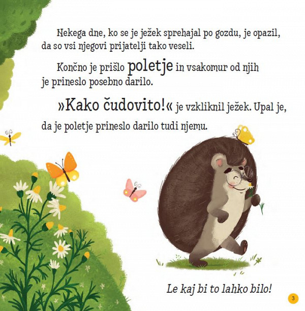 Ko pride poletje ježek opazi, da je narava vsem njegovim prijateljem prinesla darilo – metulji in čebele so dobili cvetlice in sladki nektar; mama ptička se je razveselila mladih ptičkov; medved pa je našel okusne maline. Kje pa je darilo za ježka? Preberite več